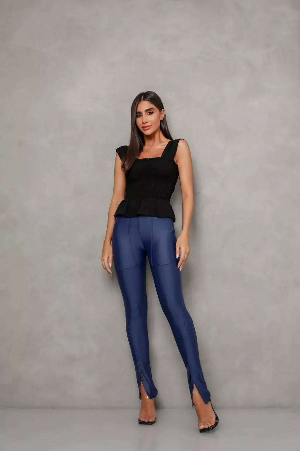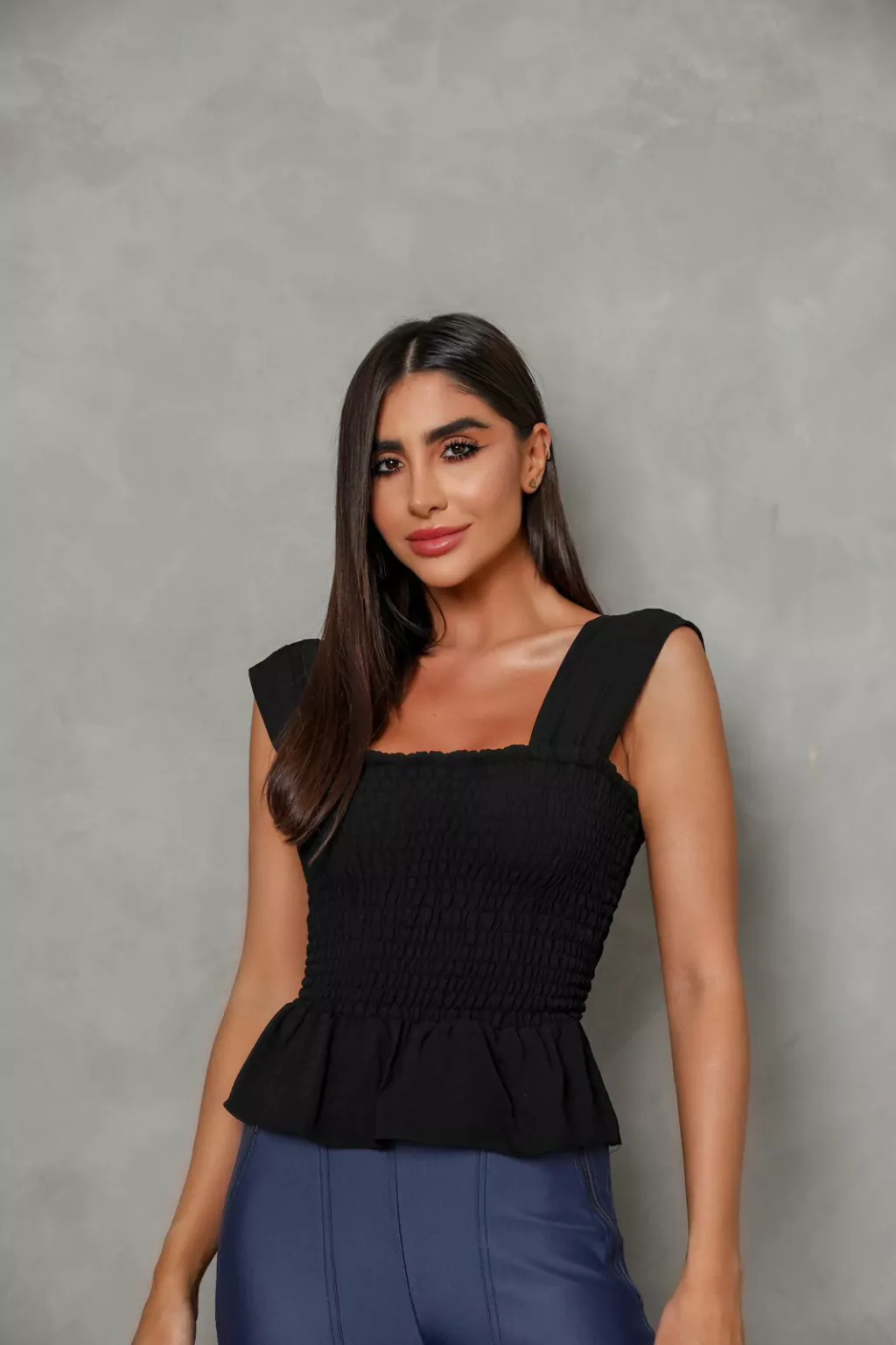 Cropped em VISCOCREPE, possui decote quadrado, alças largas e lastéx na parte inferior.