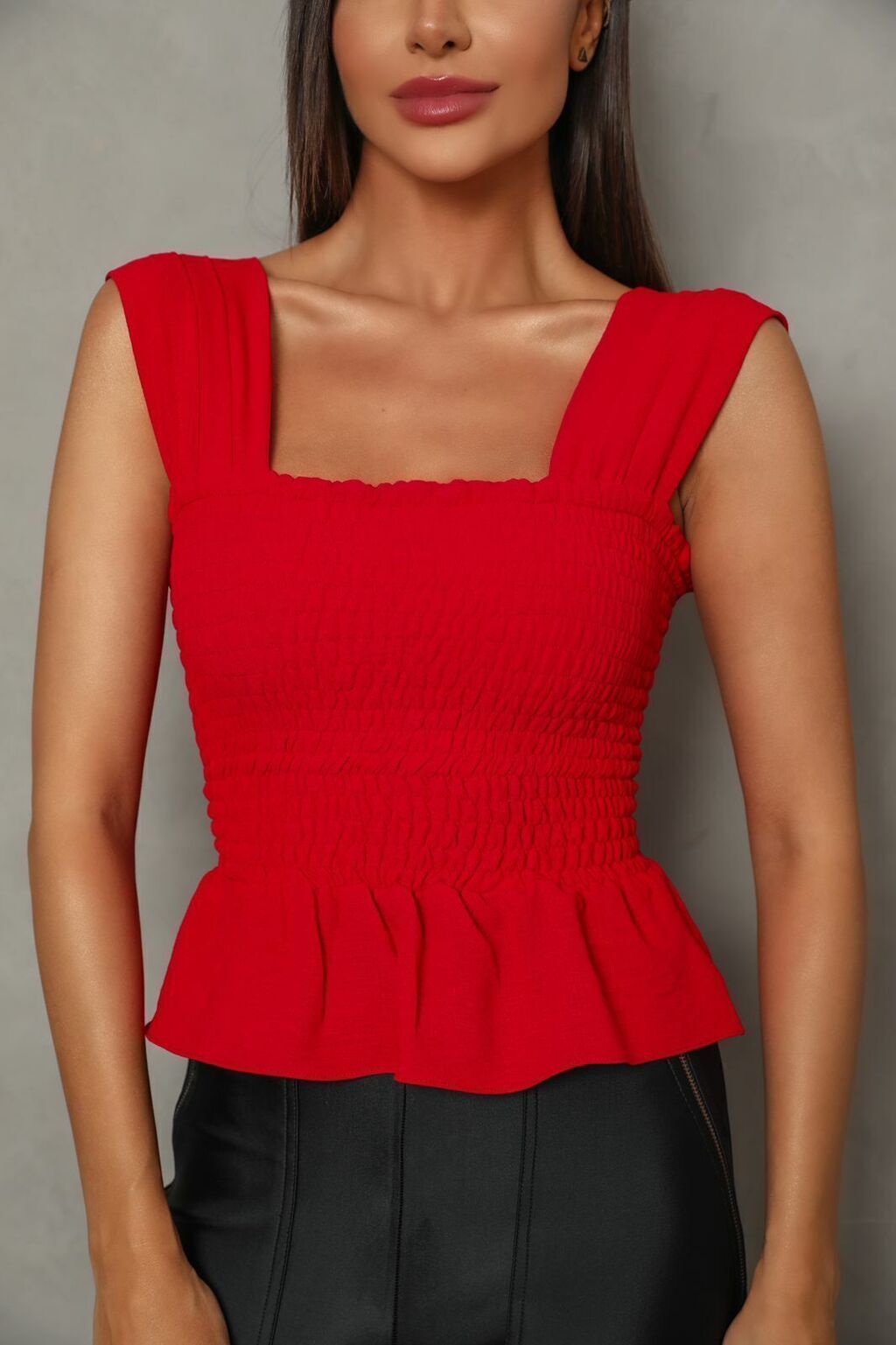 Cropped em VISCOCREPE, possui decote quadrado, alças largas e lastéx na parte inferior.