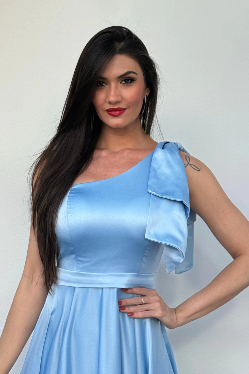 Sua saia evasê adiciona movimento e leveza ao look, ideal para quem deseja se destacar com elegância eo detalhe do laço fixo no ombro eleva o design a um nível de exclusividade. Além disso, o tecido zibeline oferece brilho sutil e estrutura firme, garantindo um caimento impecável, unindo glamour e conforto e tornando-a a escolha ideal para longas celebrações.