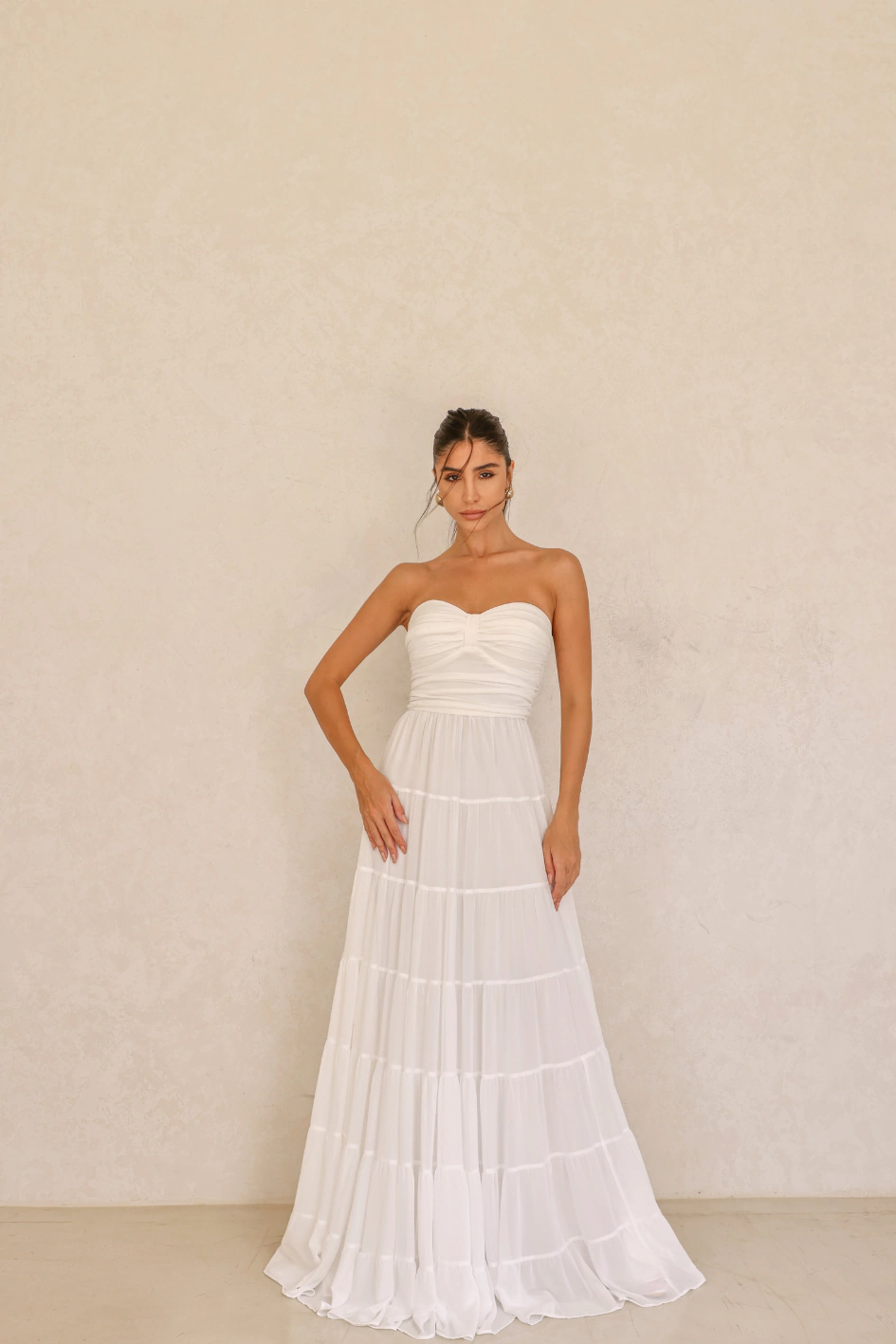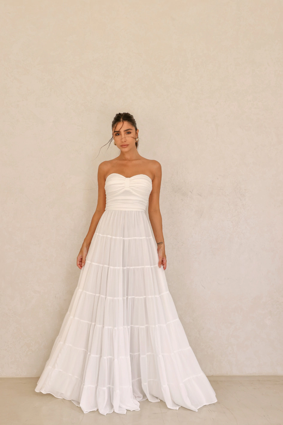 O Vestido de Festa Ipanema Branco é a escolha perfeita para quem busca um look sofisticado e fluido. Seu design tomara que caia valoriza os ombros, proporcionando um visual delicado e feminino. Confeccionado em crepe leve e esvoaçante, a peça possui camadas delicadas que garantem movimento e um caimento impecável, ideal para eventos especiais como casamentos, formaturas e jantares elegantes.