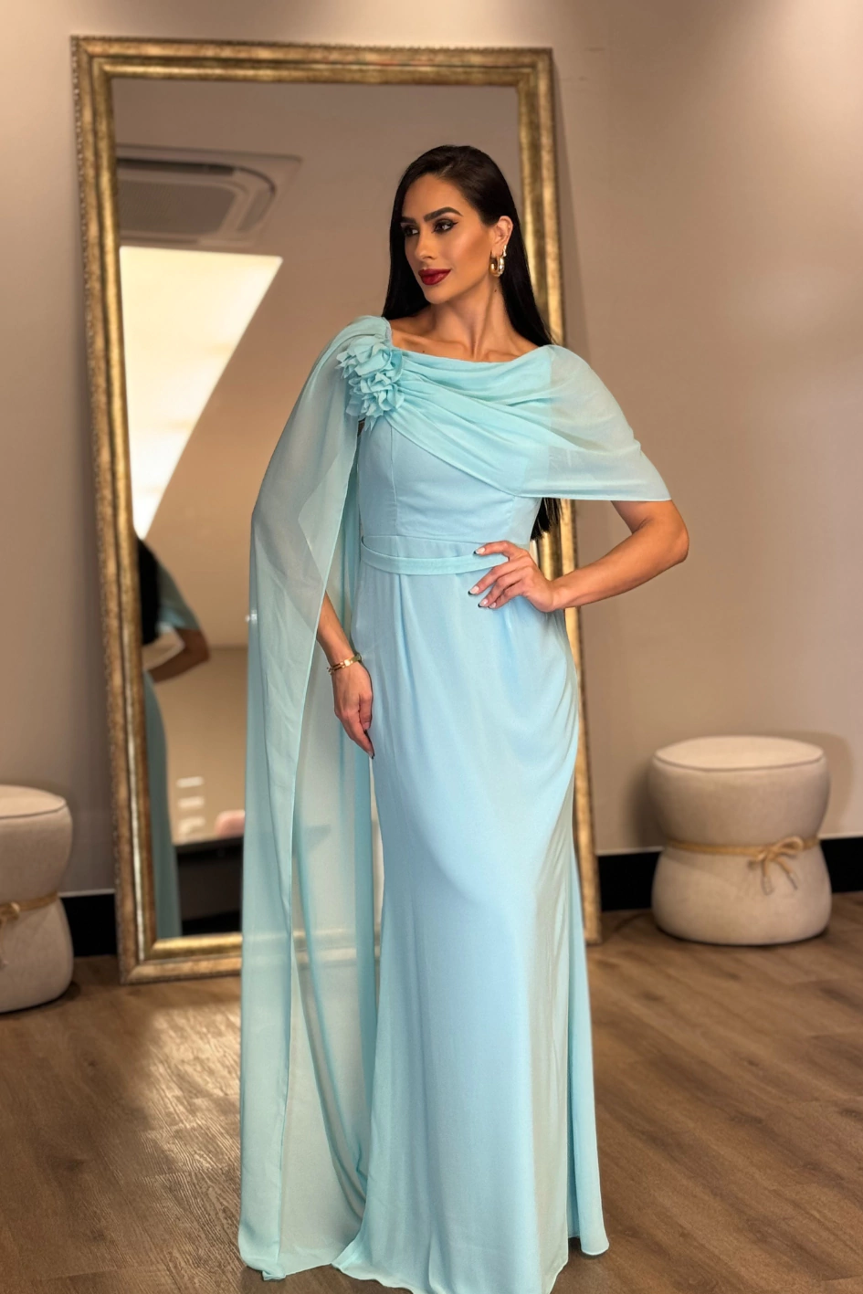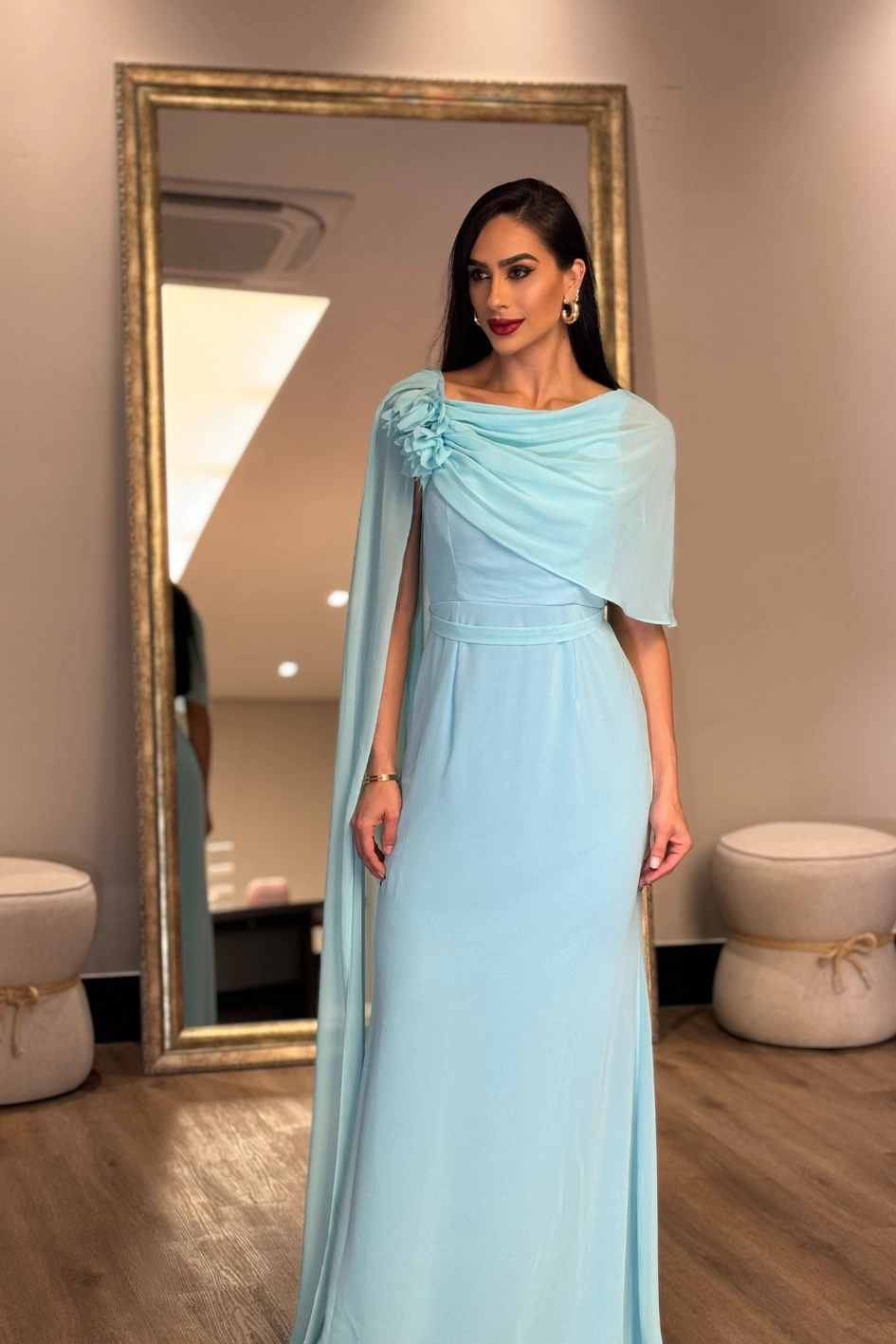 • Versatilidade e Elegância: A flor removível e a capa longa em um ombro tornam o vestido ideal para diversas ocasiões, permitindo que você personalize o visual conforme o evento.