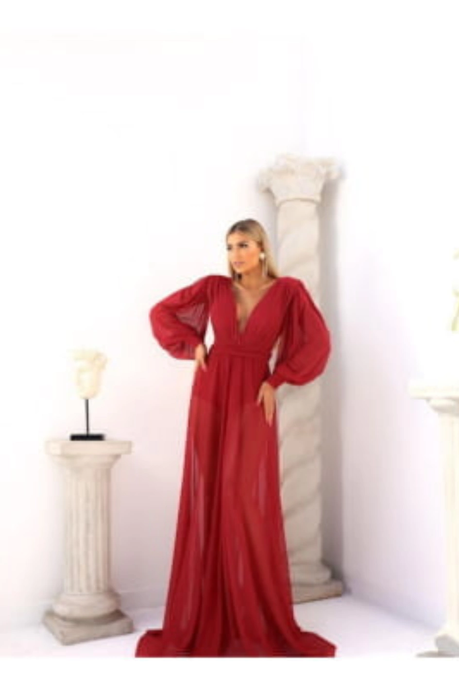 Vestido longo 2 em 1 em microtule. Possui mangas longas presas por botões que podem ser retiradas e saia fluida rodada. Possui saia forro e body.
