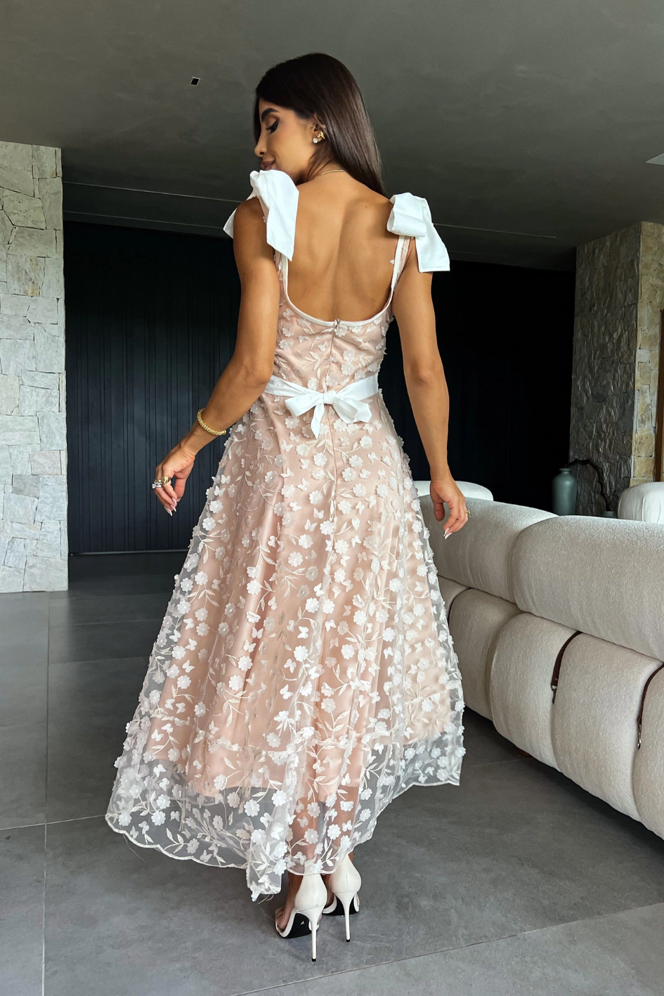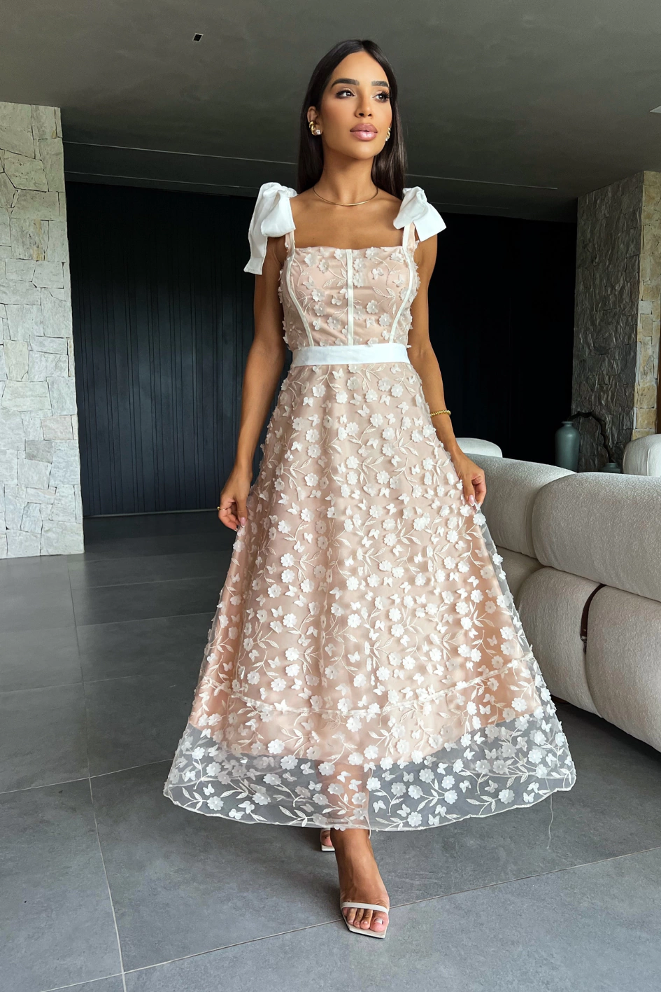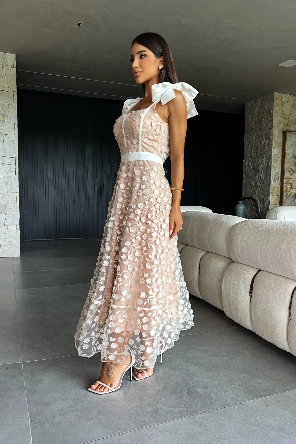 Garanta o seu Vestido Longuete com Aplicação em 3D Nude e brilhe com delicadeza e sofisticação em qualquer evento especial!