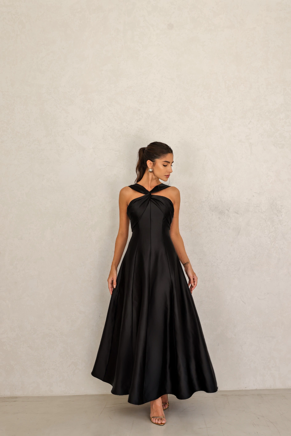 Por Que Escolher o Vestido Midi em Cetim Frente Cruzada Preto?